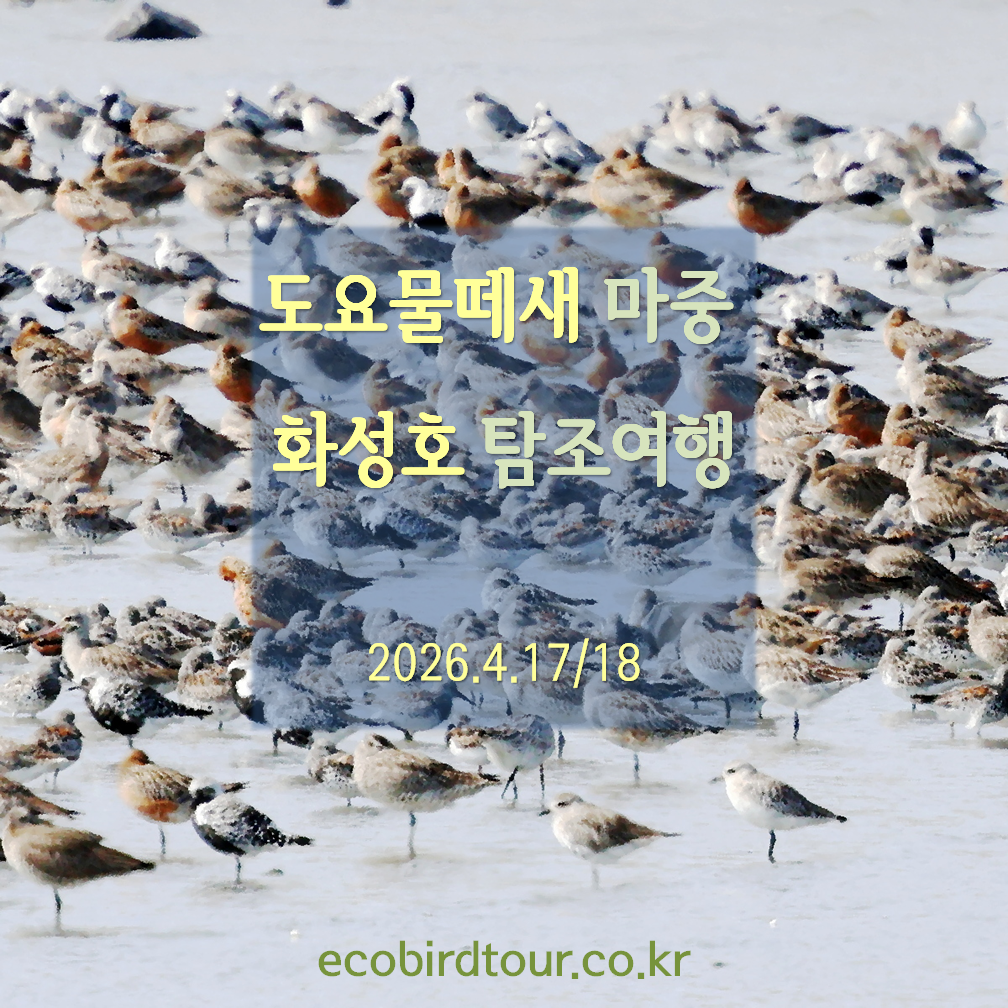 도요물떼새 마중 화성호 탐조여행 신청 마감되었습니다. 대기자 등록을 원하면 신청서를 제출해주세요. 도요물떼새들을 일컬어 SUPER BIRD, 비행천재라고 합니다. 지구의 남쪽과 북쪽을 오가는 대이동을 하기 때문입니다. 이동 거리는 수천에서 수만 Km에 이르고 밤낮없이 1주일을 날기도 합니다. 4월의 모든 서해안은 이런 도요물떼새들이 도착하여 쉬고 먹으며 기운을 추스르는 중간기착지입니다. 수도권에서 이들을 마중하기에 최고의 장소는 단연 화성호와 그 주변입니다. 더불어 해안을 따라 이동하는 여름철새들과 아직 남아 있는 겨울철새를 동시에 만날 수 있는 장소이기도 하죠. 이번 도요물떼새 마중 탐조여행은 , 로 나누어 실시합니다. 여행지 : 화성호 주변 갯벌, 습지 & 농경지2026.4.18(토, 만조 17..