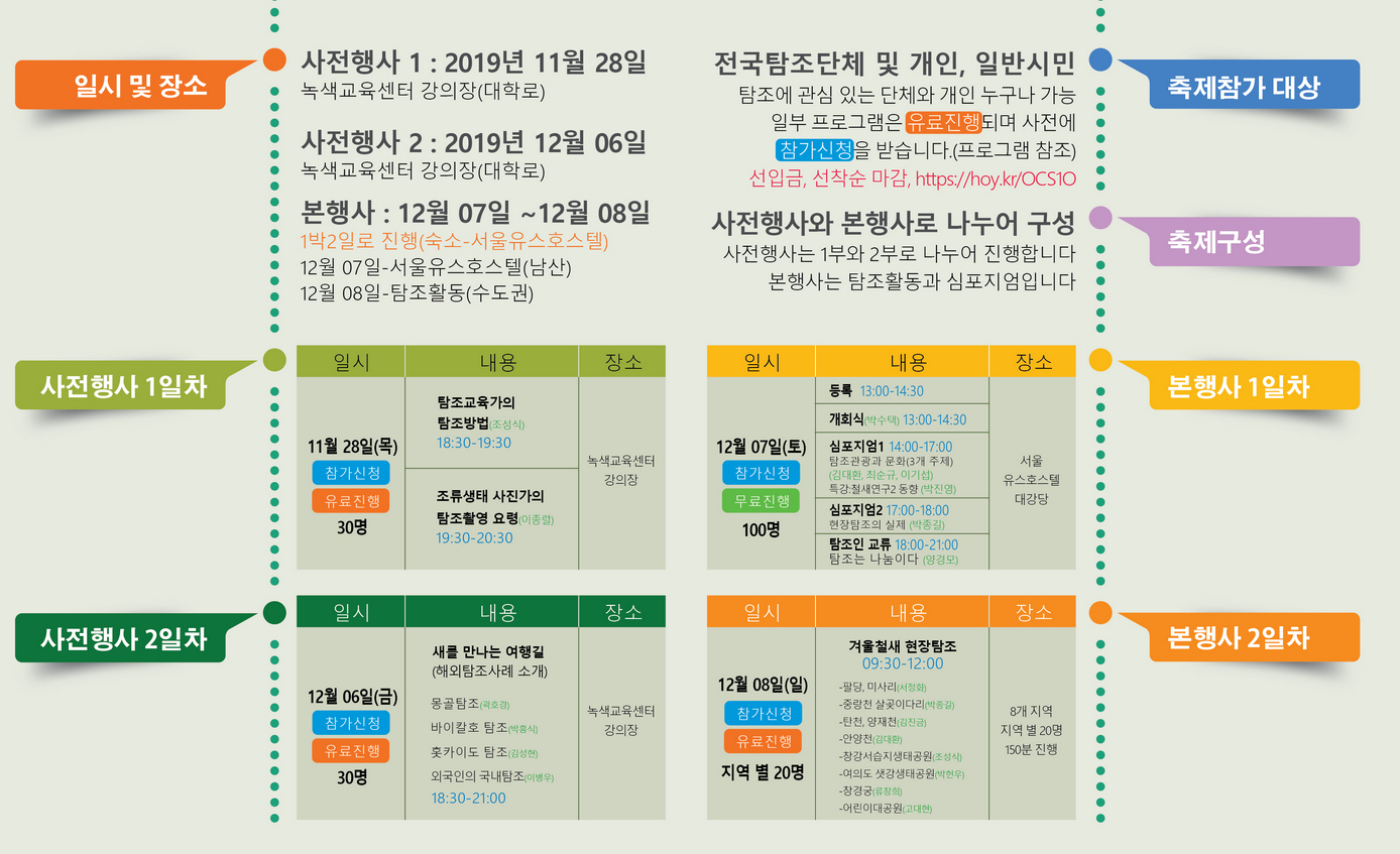전국의 탐조인들이 정보를 교환하고, 일반인들이 다양한 탐조기회를 제공하고자 환경부가 주최하고 전국탐조인네트워크가 주관하는 행사를 마련하였습니다. 하단에 세부일정을 자세히 참조하시어 신청해주시기 바랍니다. - 선착순 신청이 기준이며, 행사별로 인원제한이 있습니다. 행사별 유료와 무료가 있습니다. - 유료 행사별 1만원입니다. 만 18세미만은 모든 행사가 무료입니다. - 입금계좌 : 하나은행 201-891330-64407 김현하(행사회계담당) - 멀리서 오시
