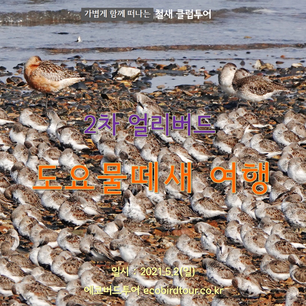 유부도 도요물떼새 여행 (2021.9) 세계적인 도요물떼새의 천국, 유부도! 유부도의 도요물떼새는 전세계적인 보물입니다. 수만 마리 도요물떼새와의 만남 통해 자연과 내가 하나되는 순간을 경험할 수 있습니다. 여행지 : 유부도(금강하구) 초빙 안내자 : 오동필 선생님 (새만금시민생태조사단 공동단장) 모집인원 : 7~12명 탐조 수준 : 초~중급 * 카풀 출발지와 현지 집결지는 신청자에게 개별 통지됩니다. 일정A (1박2일) 갯벌 탐조의 또다른 매력은 간조 때, 물길과 새들을 따라 천천히 걷는 탐조입니다. 둘째날 오전에 갯벌을 걸으며 새로운 경험을 할 수 있을 것입니다. 일시 : 2021.9.10~11(금~토) 참가비 : 20만원 * (1박2일 일정) 군산으로 직접 오시면 참가비 2만원 할인됩니다. * 자차..