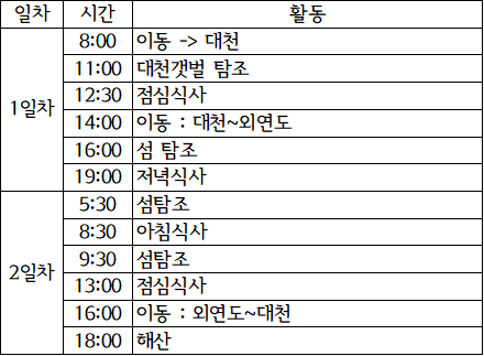 • 입도와 출도는 날씨에 크게 영향을 받습니다. 제 날짜에 섬이 들어가지 못하거나 섬에서 나오지 못 할 수 있습니다. 이로 인한 영향을 받지 않도록 일정에 여유를 두어주시기 바랍니다. 추가 숙박을 해야 하는 경우, 현장에서 실비용이 추가되며, 자유탐조로 진행됩니다.