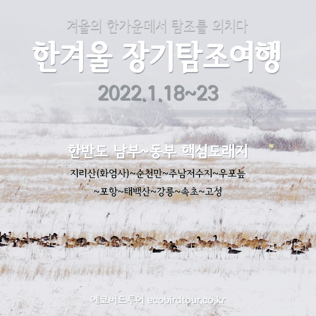 한반도는 동아시아의 겨울철새를 만나는 최고의 장소입니다. 한반도 남부와 동부의 핵심 겨울철새 도래지를 묶어서 한번의 여행으로 거의 모든 겨울철새를 마스터하는 컨셉으로 여행 일정을 준비했습니다. 겨울의 절정속으로, Go! Go!