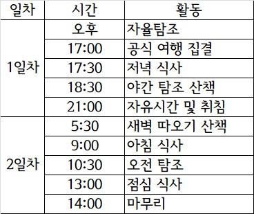 - 탐조 효율을 높이기 위해서 아침식사 또는 점심식사는 간편식으로 대체될 수 있습니다.