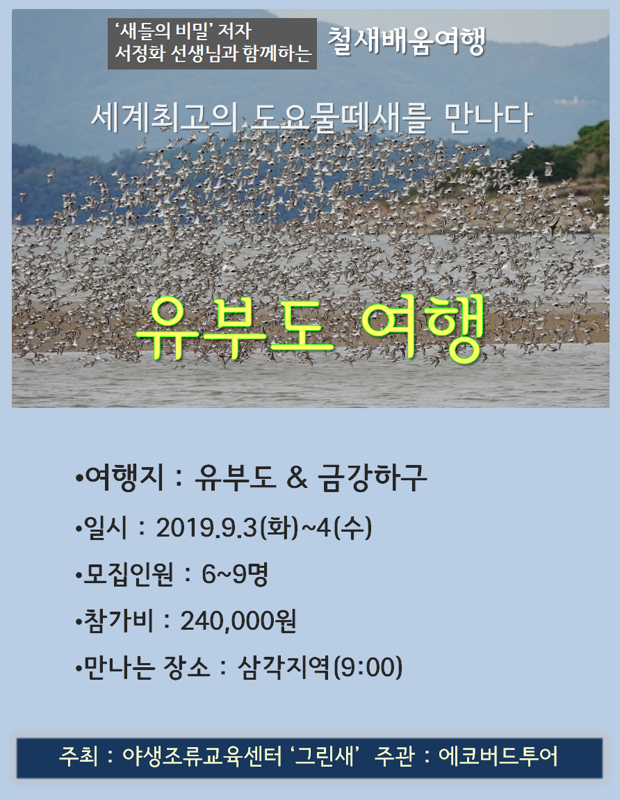 도요물떼새들이 이동하기 시작하는 9월초 세계최고의 도요물떼새 서식지 '유부도'로의 초대! 저녁과 새벽에 2회에 걸쳐 수많은 도요물떼세들을 만나러 갑니다. 넓적부리도요을 만나는 호사를 기원합니다~
