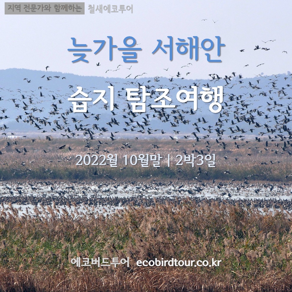 늦가을은 새들의 개체수로 보면 아마도 가장 많은 시기일 것입니다. 더 추워지면 한반도의 남쪽보다 더 먼 곳을 가는 새들이 한반도에서 겨울을 나는 새들과 함께 머물기 때문입니다. 겨울철새 중심으로 탐조하지만, 한겨울의 겨울철새들과는 사뭇 다른 새들과 새들의 생태를 만날 수 있을 것으로 기대합니다.